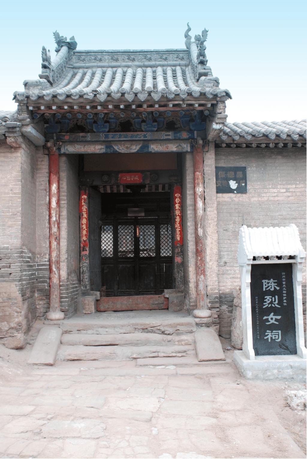 陳烈女祠坐西向東,為二進(jìn)院落布局。占地面積685平方米。大門一座,前院過殿面寬三間,單檐硬山頂;南北配殿各面寬三間,單檐硬山頂。后院正殿面寬三間,單檐硬山頂,前設(shè)小抱廈;后院正殿內(nèi)供奉陳烈女塑像。祠內(nèi)存有明崇禎七年(1634)“圣旨(復(fù)制品)”一道,新繪壁畫16平方米。2007年6月,陳烈女祠被忻州市人民政府公布為市級文物保護(hù)單位。