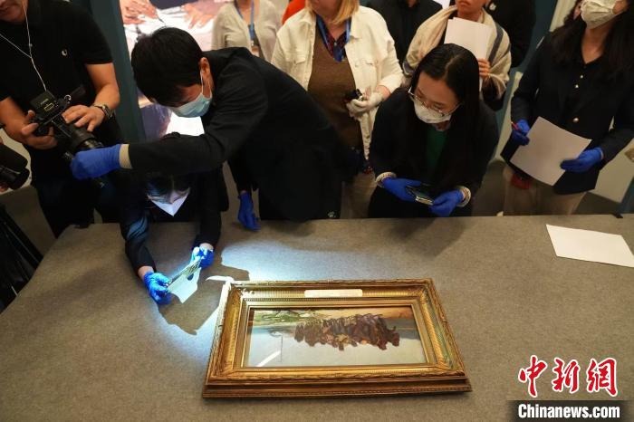 中俄兩國(guó)專(zhuān)家共同檢視剛開(kāi)箱的《伏爾加河上的纖夫》油畫(huà)草圖。 史春陽(yáng) 攝