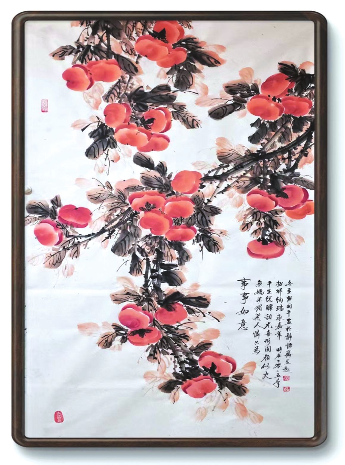 在樊國(guó)平眾多題材探索中,《事事如意》系列柿子圖可謂其藝術(shù)精神與人生哲思的縮影。這些作品超越了尋?;B(niǎo)畫(huà)的怡情悅性,成為她寄托情懷、叩問(wèn)生命的重要載體。畫(huà)中那一串串、一簇簇丹柿,色澤溫潤(rùn),形態(tài)豐盈,承載著諧音“事事如意”的吉祥寓意,滿足了社會(huì)對(duì)美滿生活的樸素祈愿。她以此通俗意象為入口,引領(lǐng)觀者步入一個(gè)融匯儒、道、佛哲學(xué)理念的深邃境界,實(shí)踐著中國(guó)藝術(shù)“技進(jìn)乎道”“以畫(huà)載道”的至高追求。