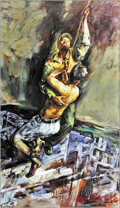 作品《空中救援》中,觀者首先感受到的就是難度。主題表現(xiàn)的事件難度和畫面表現(xiàn)處理的難度交織在一起,讓我們?cè)隗@險(xiǎn)、焦急的心理壓力下感受到生命的脆弱。空中救援成了生命的唯一通道。救援同樣是險(xiǎn)象環(huán)生、驚心動(dòng)魄。從畫面處理技巧上是一種挑戰(zhàn),天空與地面的透視關(guān)系,動(dòng)感與靜態(tài)的對(duì)立統(tǒng)一,那種命懸一線的緊迫感對(duì)心理的沖擊力,通過大刀闊斧的刮刀、筆觸處理,和蒼涼緊迫的色調(diào)關(guān)系,準(zhǔn)確地展示了主題思想,大膽省略了一些不必要的細(xì)節(jié)描寫。用大筆觸、大色塊表現(xiàn)背景的壓抑和險(xiǎn)峻,救援主體成為沖破這一重壓的希望之色。沒有去刻意刻畫天與地的真實(shí)場(chǎng)景,簡(jiǎn)潔概括但不呆板空洞,這種果斷的駕馭,是續(xù)鶴賢真實(shí)實(shí)力的體現(xiàn)。 邢晨聲 文