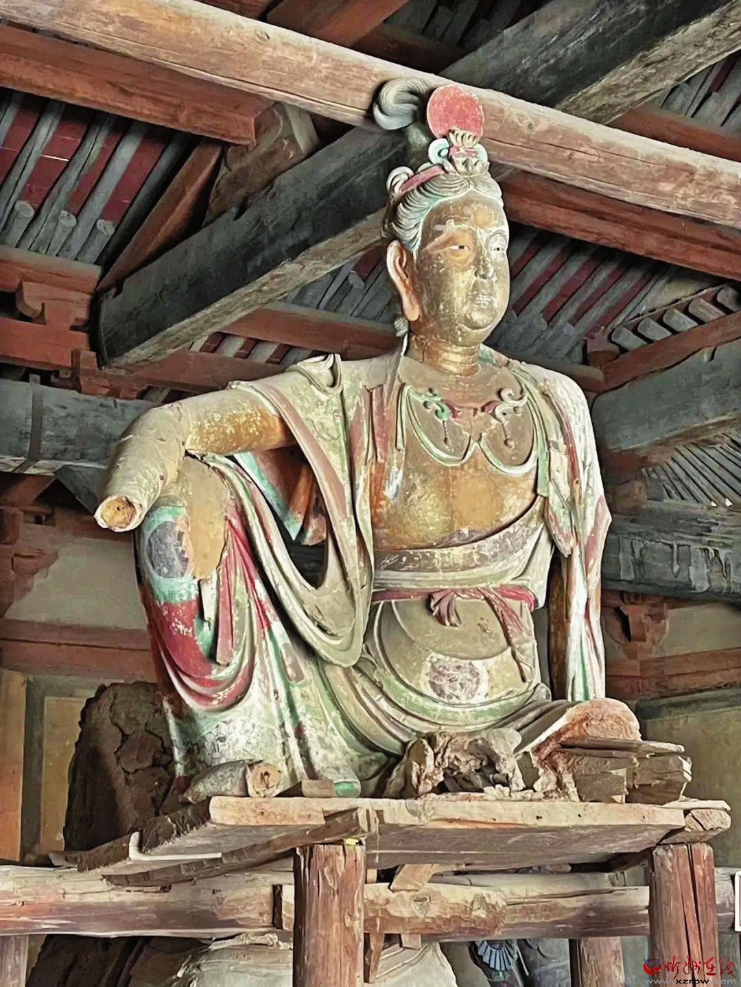 巖山寺坐北朝南,平面呈不規(guī)則長(zhǎng)方形。寺內(nèi)正殿已毀,現(xiàn)存建筑主要有文殊殿、伽藍(lán)殿、地藏殿、馬王殿等。其中,文殊殿面闊五間,進(jìn)深六椽,單檐歇山頂。殿內(nèi)保存有金代彩塑水月觀音、脅侍、天王和文殊坐騎等。水月觀音面額豐腴,衣帶飄灑,若乘風(fēng)翩翩欲飛。