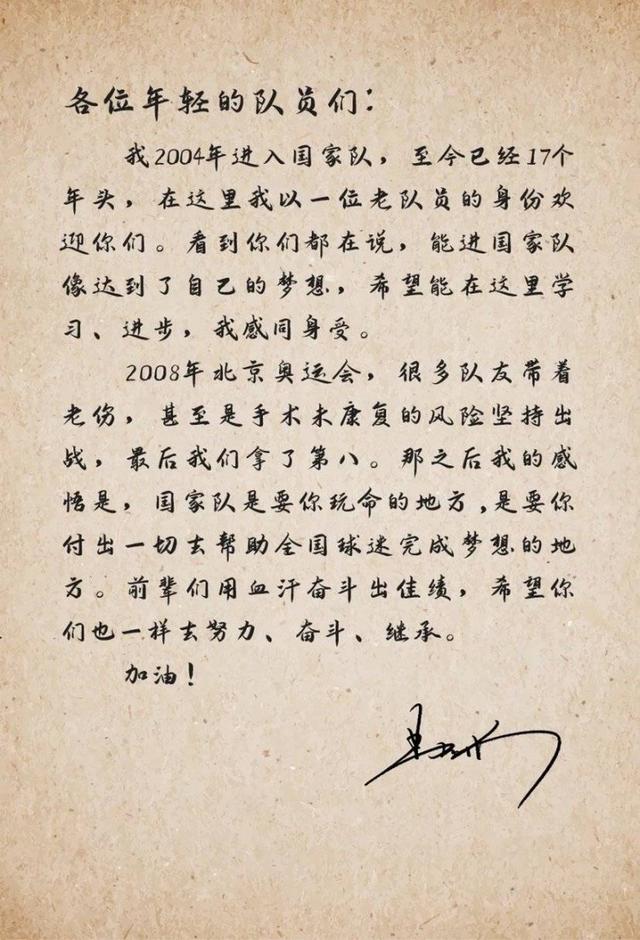 易建聯(lián)在信中回顧了自己首次入選國(guó)家隊(duì)的感受,表示自己完全能理解新隊(duì)員此刻的心情,他尤其強(qiáng)調(diào)了榮譽(yù)感與責(zé)任感,對(duì)這些小兄弟們說“國(guó)家隊(duì)是要你玩命的地方”,“各位年輕隊(duì)員們,我2004年進(jìn)入國(guó)家隊(duì),至今已經(jīng)有17個(gè)年頭,在這里我以一位老隊(duì)員的身份歡迎你們??吹侥銈兌荚谡f,能進(jìn)國(guó)家隊(duì)像達(dá)到了自己的夢(mèng)想,希望能在這里學(xué)習(xí)、進(jìn)步,我感同身受。2008年北京奧運(yùn)會(huì),很多隊(duì)友帶著老傷,甚至是手術(shù)未康復(fù)的風(fēng)險(xiǎn)堅(jiān)持出戰(zhàn),最后我們拿到了第八。那之后我的感悟是,國(guó)家隊(duì)是要你玩命的地方,是要你付出一切去幫助全國(guó)球迷完成夢(mèng)想的地方。前輩們用血汗奮斗出佳績(jī),希望你們也一樣去努力、奮斗、繼承?!?/span>