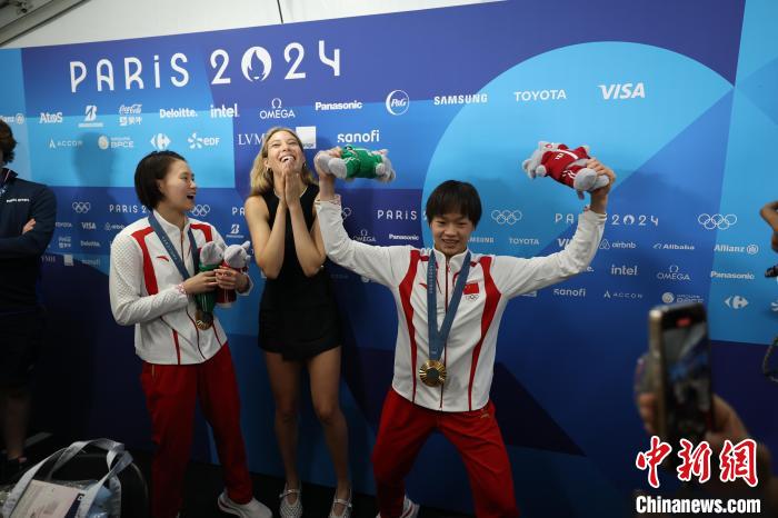 當(dāng)?shù)貢r間7月31日,在巴黎奧運(yùn)會跳水女子雙人10米臺項目中,中國隊組合陳芋汐/全紅嬋獲得冠軍。谷愛凌(中)在賽后化身粉絲與陳芋汐(左)、全紅嬋合影。 中新社記者 富田 攝
