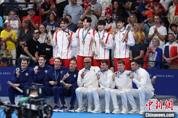 當(dāng)?shù)貢r間8月4日,在巴黎奧運(yùn)會游泳項目男子4x100米混合泳接力決賽中,由徐嘉余、覃海洋、孫佳俊、潘展樂組成的中國隊奪得金牌。圖為獲獎運(yùn)動員合影。 中新社記者 富田 攝