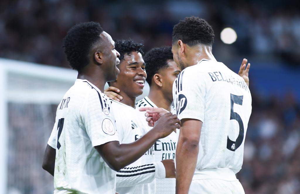 落在下風的皇馬迅速連入兩球扭轉(zhuǎn)局面。第82分鐘,維尼修斯左路帶球一路奔襲入禁區(qū),并于底線附近送出傳中,貝林厄姆中路墊射破網(wǎng)。第86分鐘,楚阿梅尼又在小禁區(qū)邊緣將羅德里戈開出的角球頂入球門,助皇馬將場上比分扳為3:3平。