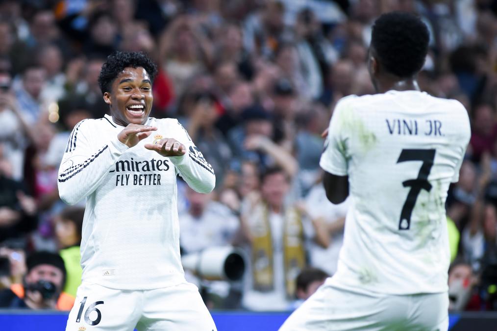 4月1日,皇家馬德里隊球員恩德里克(左)和維尼修斯在比賽中慶祝進球。新華社發(fā)(古斯塔沃·巴連特攝)