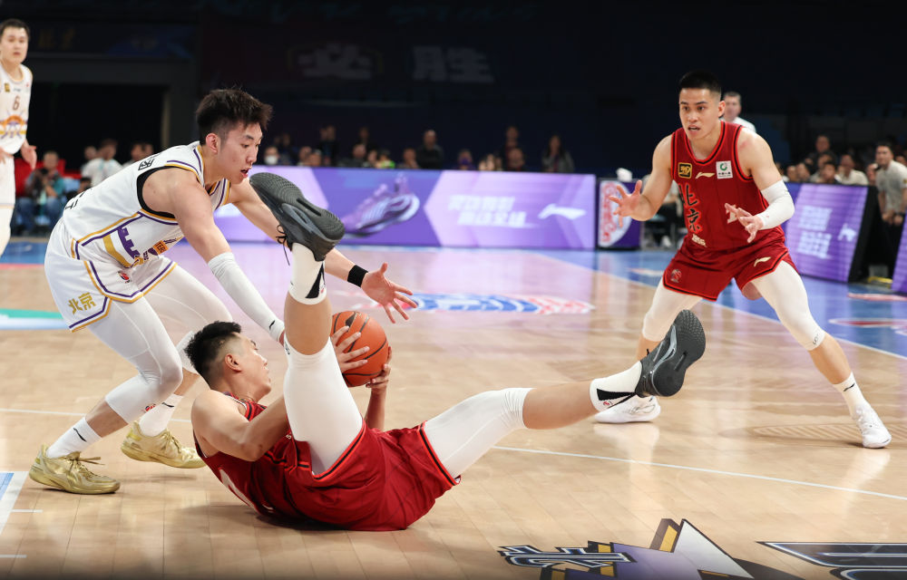 4月14日,北京隊(duì)球員翟曉川(中)在比賽中倒地拼搶。新華社記者 王楷焱 攝