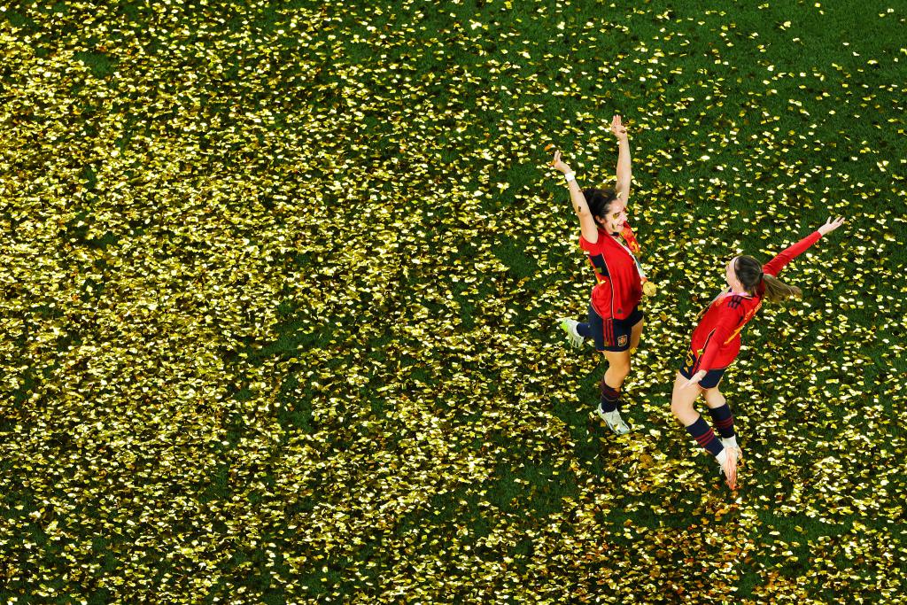 圖為西班牙隊球員在2023年國際足聯女足世界杯決賽賽后慶祝奪冠。新華社記者 白雪飛 攝