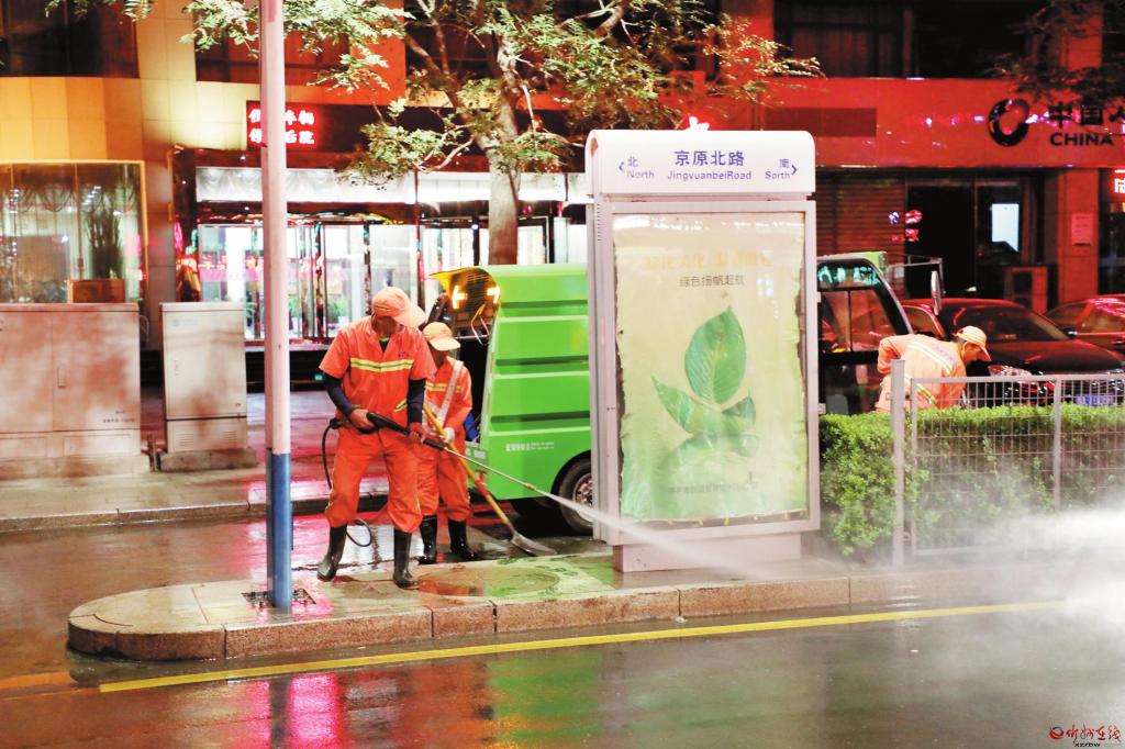 九月九日晚,原平市環(huán)衛(wèi)工人利用晚上路上人少車(chē)少的有利時(shí)機(jī),清洗京原北路的道路死角。 本報(bào)通訊員 攝