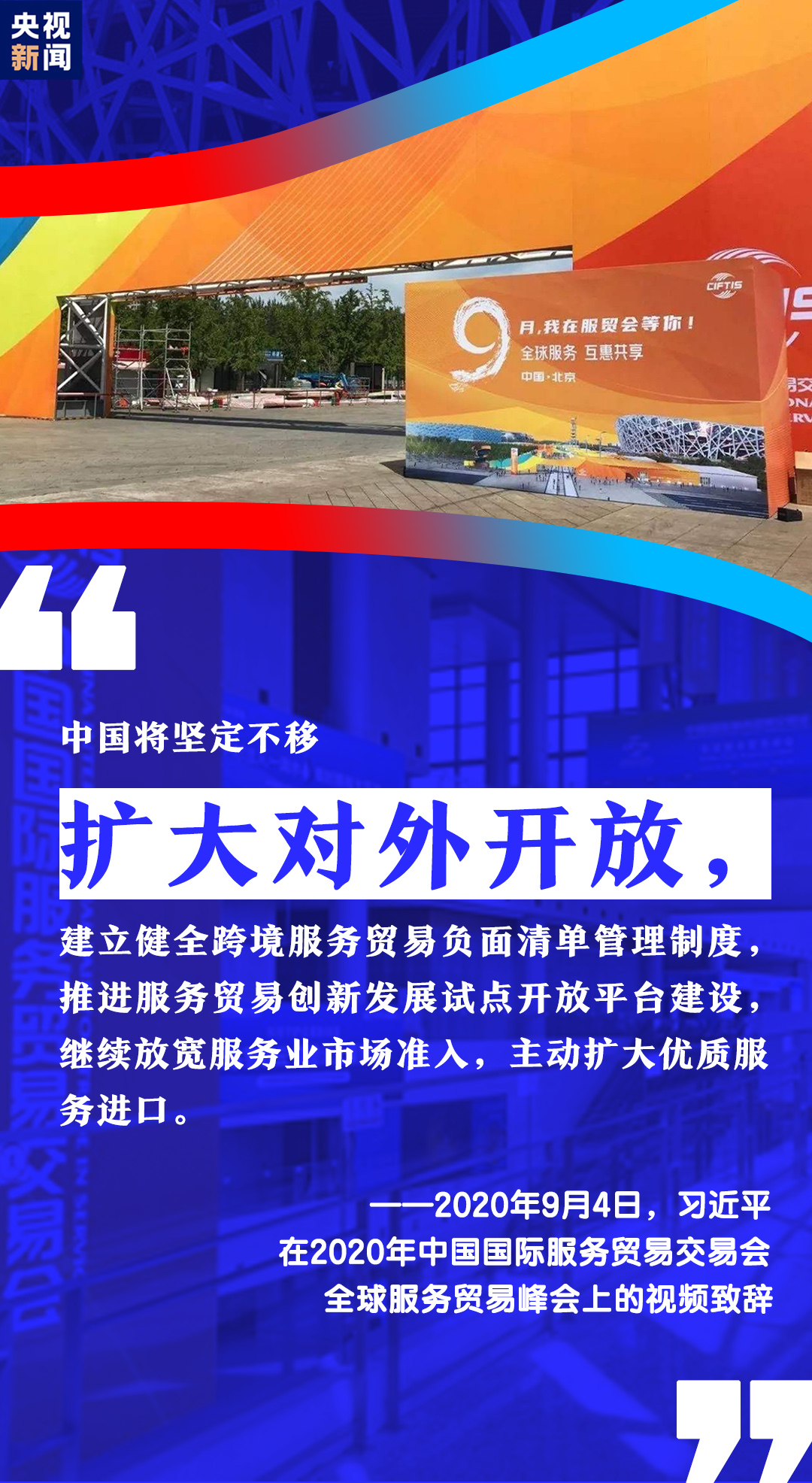 習(xí)近平表示,中國舉辦2020年中國國際服務(wù)貿(mào)易交易會,就是搭建起平臺和橋梁,讓各國人民充分展示服務(wù)貿(mào)易領(lǐng)域新發(fā)展新突破,共同享受人類社會發(fā)展進步新技術(shù)新成果。