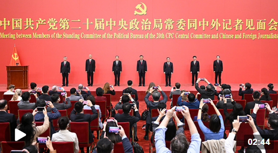 在中國共產(chǎn)黨第二十屆中央委員會第一次全體會議上當選的中共中央總書記習(xí)近平和中共中央政治局常委李強、趙樂際、王滬寧、蔡奇、丁薛祥、李希,23日中午在人民大會堂同采訪中共二十大的中外記者親切見面。