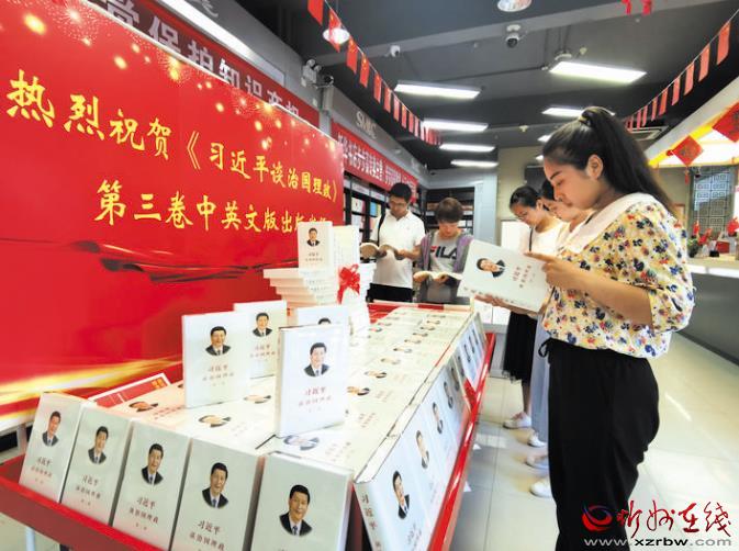 8月7日,在忻州市新華書店,讀者正在翻閱新發(fā)行的《習近平談治國理政》第三卷。該書自出版發(fā)行以來,忻州市新華書店第一時間設立專架,重點展示銷售。同時,書店還采取多種形式,積極組織力量深入社區(qū)、農(nóng)村、黨政機關、企事業(yè)單位、大專院校、部隊開展宣傳征訂工作,保證廣大黨員干部群眾能夠及時購買閱讀到《習近平談治國理政》第三卷。 張存良 攝