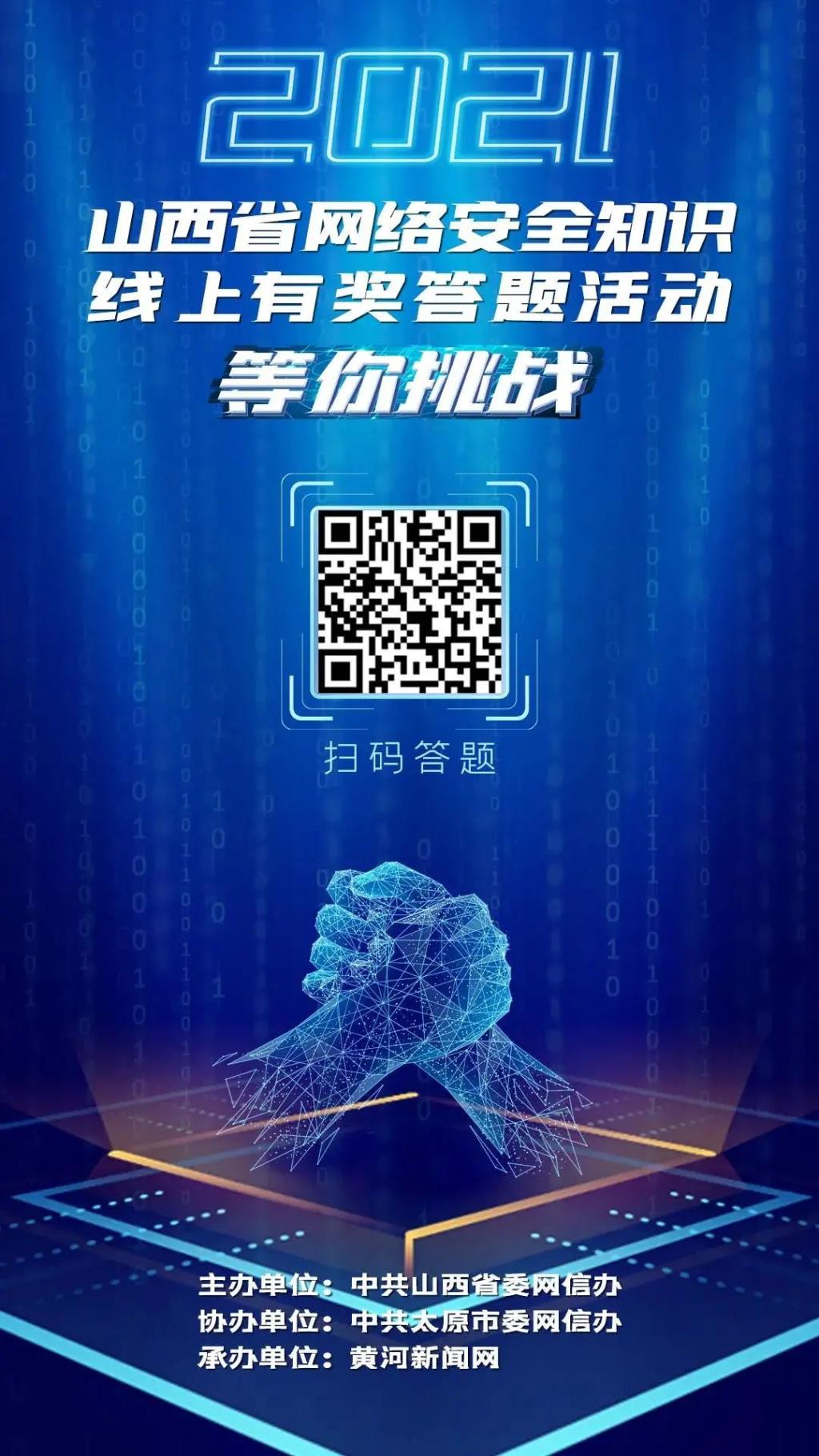 為深入宣傳貫徹《中華人民共和國(guó)網(wǎng)絡(luò)安全法》等相關(guān)法律法規(guī),進(jìn)一步普及網(wǎng)絡(luò)安全知識(shí),提升全社會(huì)網(wǎng)絡(luò)安全意識(shí)和防護(hù)技能,在2021年國(guó)家網(wǎng)絡(luò)安全宣傳周期間,由中共山西省委網(wǎng)信辦主辦、中共太原市委網(wǎng)信辦協(xié)辦、黃河新聞網(wǎng)承辦的“2021山西省網(wǎng)絡(luò)安全知識(shí)線上有獎(jiǎng)答題活動(dòng)”于10月9日正式啟動(dòng)。
