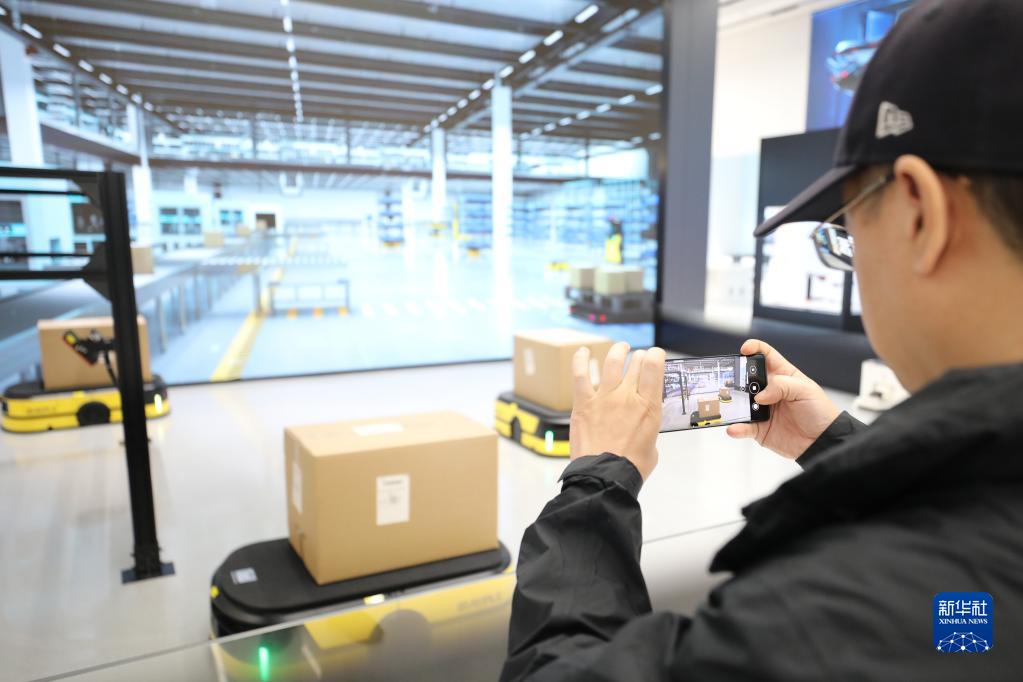 5月22日,參觀者在浙江大華技術(shù)股份有限公司的展廳內(nèi)拍攝一款智能運(yùn)輸車。新華社記者 杜瀟逸 攝