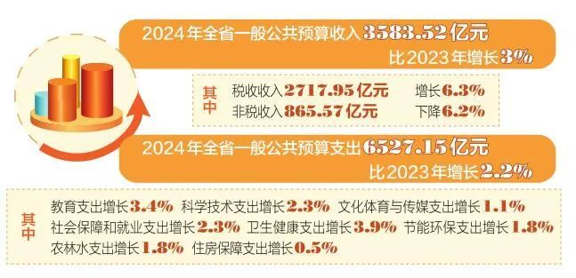 收支管理是財政工作的核心。按照政府預算報告,2024年全省一般公共預算收入3583.52億元,比2023年增長3%。其中,稅收收入2717.95億元,增長6.3%;非稅收入865.57億元,下降6.2%。全省一般公共預算支出6527.15億元,比2023年增長2.2%。其中,教育支出增長3.4%,科學技術(shù)支出增長2.3%,文化體育與傳媒支出增長1.1%,社會保障和就業(yè)支出增長2.3%,衛(wèi)生健康支出增長3.9%,節(jié)能環(huán)保支出增長1.8%,農(nóng)林水支出增長1.8%,住房保障支出增長0.5%。