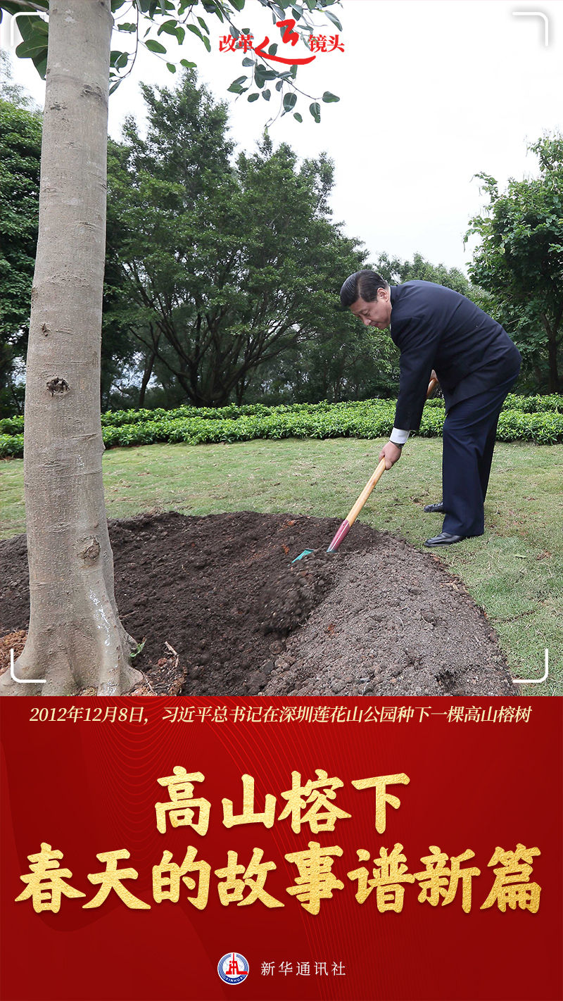 深圳蓮花山,一棵迎風而立的高山榕,挺拔茂盛。樹前一方花崗石碑上,鐫刻著“習近平手植樹”。