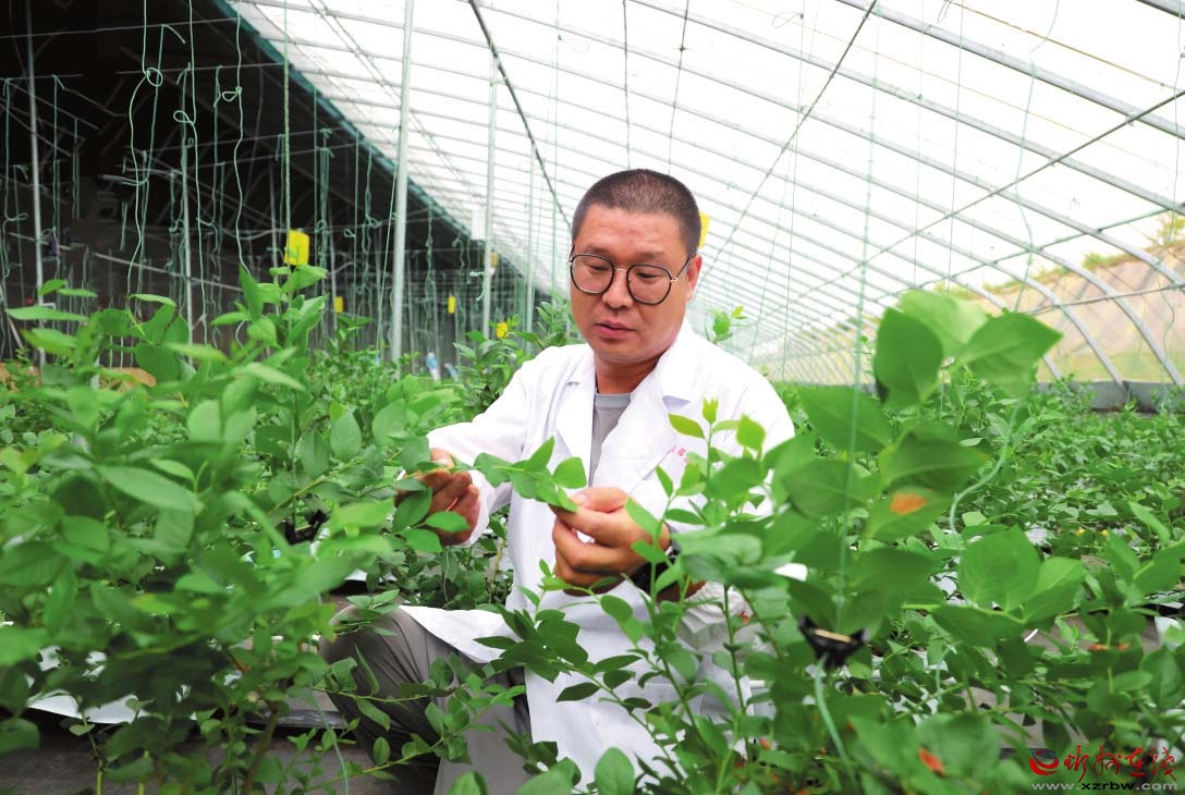 智慧大棚負(fù)責(zé)人馮祥君察看藍(lán)莓生長(zhǎng)情況。