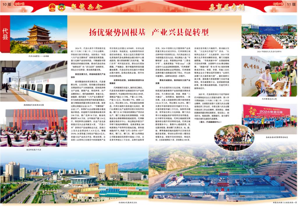2024年,代縣認真學習貫徹落實黨的二十大和二十屆二中、三中全會精神,積極踐行新發(fā)展理念,創(chuàng)新提出“構(gòu)筑八大產(chǎn)業(yè)支撐體系”的轉(zhuǎn)型發(fā)展思路,著力化解產(chǎn)業(yè)結(jié)構(gòu)風險,不斷破除對資源型經(jīng)濟的路徑依賴,推動代縣經(jīng)濟由“獨鐵經(jīng)濟”向“多元經(jīng)濟”結(jié)構(gòu)轉(zhuǎn)變,深化全方位轉(zhuǎn)型、推動高質(zhì)量發(fā)展。