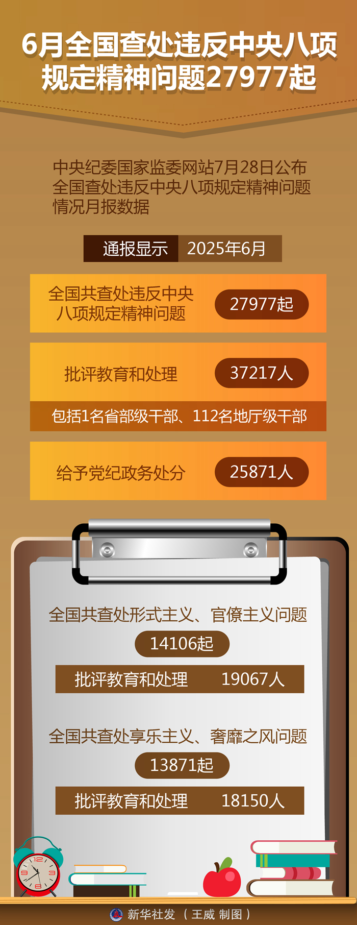 新華社北京7月28日電(記者孫少龍)中央紀(jì)委國家監(jiān)委網(wǎng)站28日公布全國查處違反中央八項規(guī)定精神問題情況月報數(shù)據(jù)。通報顯示,今年6月,全國共查處違反中央八項規(guī)定精神問題27977起,批評教育和處理37217人(包括1名省部級干部、112名地廳級干部),給予黨紀(jì)政務(wù)處分25871人。