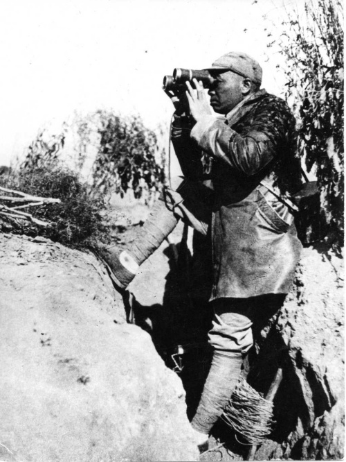 “誰敢橫刀立馬,唯我彭大將軍。”照片中,彭德懷大半個(gè)身體露在戰(zhàn)壕外,左腳踏在戰(zhàn)壕底,右腳蹬著戰(zhàn)壕前沿,坐靠在戰(zhàn)壕后沿上,手持望遠(yuǎn)鏡,神情專注地觀察戰(zhàn)況。